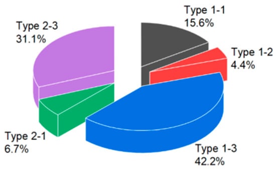 According to the experiments conducted in this study, the proportions of the five blockage types are illustrated in Figure 9. Type 1-3, which has the highest deposition on the landslide side of the river, is the most common. All the sliding masses enter the flume and form the landslide dam in the experiments. In most tests, the maximum dam height Hmax is observed on the landslide side of the river because the landslide materials slide into the flume at a low velocity. Hmin is almost always on the opposite side because the final volume of the landslide materials has lower speeds and moves slowly across the surface of the deposition near the landslide side. The influence of slide angle, particle size, and landslide volume on the characteristics of deposition geometry and blockage type will be analyzed in the following sections.