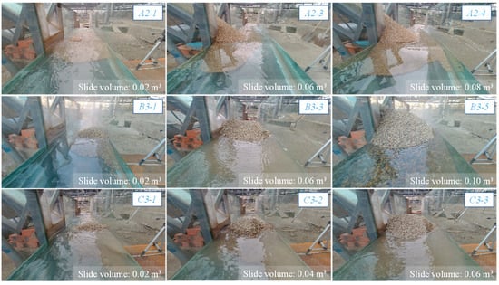 All the landslide and dam formation processes were recorded by three digital video cameras. The following experimental results are video snapshots and include some characteristic data of the landslides and dams measured from the videos, such as the duration of the landslide, velocity of the landslide, and geometric sizes of the landslide dam. Some objects whose sizes are known and constant between the videos were taken as references to ensure the accuracy of the data.
