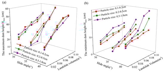 The landslide dam consists of landslide materials, so the landslide volume is the most significant factor [,] that directly determines the formation of a landslide dam and the degree of river blockage. Figure 10 shows that the dam blockage type varies as the volume changes. The blockage degree, as well as Hmax and Hmin, increase as the volume increases. It can be inferred that the larger the landslide volume, the larger the cross-section of the landslide dam. The landslide material will deposit to form the landslide dam instead of being flushed away by the water flow.