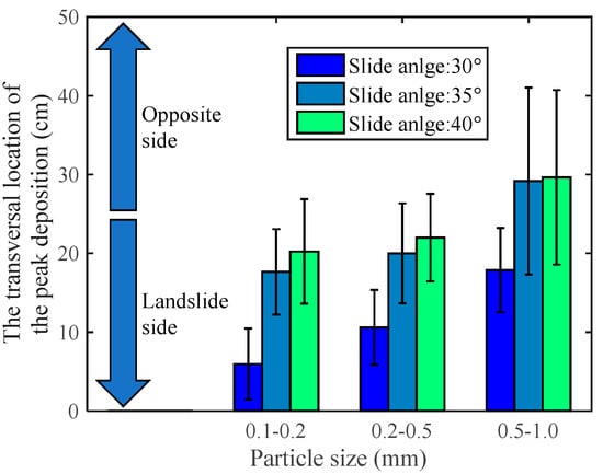 The particle size of landslide material determines the characteristics of landslide movement. Figure 12 and Figure 13 show that as the particle size increases, the location of the highest deposition will significantly shift from the landslide side to the opposite side. This phenomenon will not substantially change the blockage degree or dam heights but will obviously change the dam blockage type. Thus, particle size is a key factor in determining the location of the highest and lowest depositional heights in the channel. In addition, landslides with larger particle sizes are more likely to completely block rivers since they can form dams with smaller height differences.