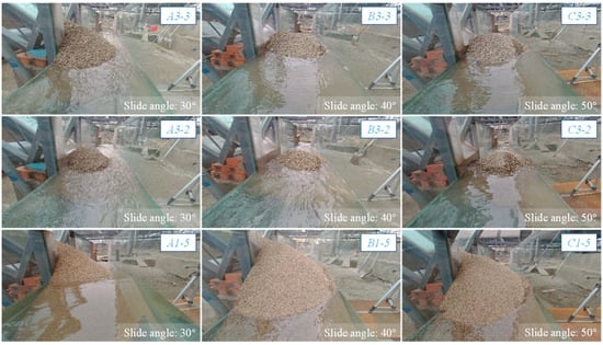 One of the purposes of this study is to reveal the influence of landslide materials and slope conditions on river blockage. Thus, a total of 45 experiments were carried out. Table 1 summarizes the characteristics of the landslide volume, material size, and slope conditions of the 45 experiments. It is more likely to obtain a similar river blockage if the disparity of the landslide volume is minimized between repeated tests. Therefore, several pretests were conducted to determine the maximum volume for completely blocking the river and the minimum volume for partially blocking the river without material being flushed away immediately after deposition. Following that, the experiments were divided into five groups of different landslide volumes to explore the influences of volume on landslide dam formation processes and the types of river blockages. Thus, the chute of this experiment was designed to be adjustable from 30° to 40°. During the experiment, the landslide material in the storage tank was released after a steady water flow rate in the flume was established. The experiment was complete when all the landslide materials that had been emptied into the flume had been flushed away by the water.