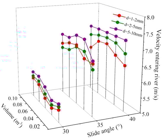 As shown in Figure 16, the velocity of landslides entering rivers is mainly affected by the slide angle, and the other two factors, including landslide volume and particle size, have relatively small influences on the velocity of landslides entering rivers. The fluctuation range of the velocity is within 1 m/s when the slide angle is the same but becomes 2 m/s if the slide angle changes. As the slide angle increases, not only does the initial potential energy of landslide materials increase directly, but the dissipated friction energy is also reduced during the movement process, which results in a significant improvement in the transformation of potential energy into kinetic energy. Therefore, the increase in slide angle makes the landslide velocity rise significantly, and the range of the velocity for different slide angles is much larger than that for the same slide angle. In addition, landslide volume and particle size are two other factors that affect the velocity of landslides entering rivers, and the influence of landslide volume on the landslide velocity is less than the influence of particle size. In actuality, the velocity of landslides entering rivers does not change significantly and even decreases slightly when the landslide volume increases. Landslides with smaller volumes are more likely to roll freely without too much influence from other particles. Following this perspective, as the particle size increases, landslide materials with the same volume could consist of fewer particles, and the interactions among particles decrease; as a result, landslide materials are more easily accelerated in the movement process and present a higher velocity, as observed in the experiments.