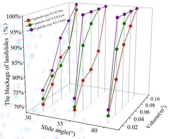 The degree of river blockage can be divided into two cases: partial blockage and complete blockage. There were 60% partial blockages and 40% complete blockages in these tests. The influences of slide angle, landslide volume, and particle size on the degree of river blockage are summarized from the test data, as shown in Figure 17.