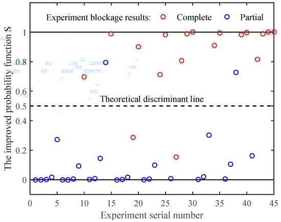 Figure 18 presents the discriminant results of the improved probability model as a scatter plot. These points are divided into two categories by the line S = 0.5. If a point is located below this line, the discriminant result is partial blockage; otherwise, the discriminant result is complete blockage.