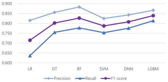 Figure 3 compares the average execution time of the six models. The LR, DT, RF, and LightGBM models showed relatively good performance within 3 s, while the SVM and DNN models have longer execution times. Especially in the case of the DNN model, it took over 27 s to run 30 epochs.