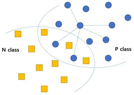 Data augmentation in SMOTE is performed based on K-NN. Figure 4 illustrates how artificial records are generated in SMOTE. It considers only the records in the P class when generating new records. From the P class data, a reference vector is first selected. Then, K neighboring vectors close to the reference vector are chosen using K-NN. These vectors are connected to the reference vector with lines, as shown in Figure 4. Finally, new vectors are randomly extracted from the connection lines and added to the minor class until the ratio between the classes becomes even.