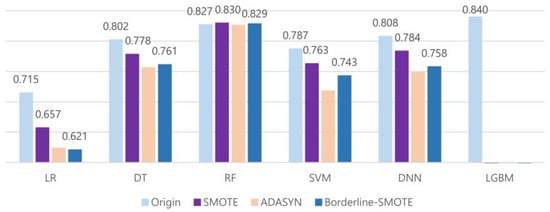 Figure 5 visualizes the change in F1-scores of the proposed prediction models before and after applying SMOTE, ADASYN, and Borderline-SMOTE. The average F1-scores of all models decreased after applying the oversampling techniques, except the RF model; the performance improvement of the RF model was also not so significant. Among the oversampling techniques, SMOTE showed the best performance, whereas ADASYN performed the worst.