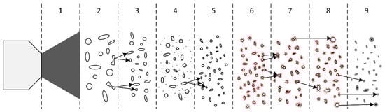 The mechanism of CWF spraying and burning. 1—mixture of fuel and SA; 2—destruction of large fragments; 3—formation of large and small drops; 4—evaporation of moisture; 5—additional destruction; 6—combustion of CWF particles; 7—coagulation of large fuel drops; 8—sintering; 9—formation of the ash.