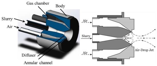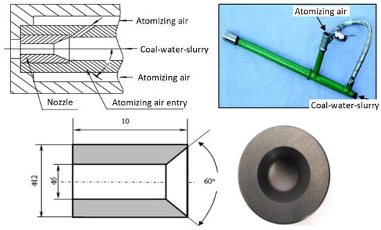 The slurry in the direct-flow channel was sprayed forming an aerosol after exposure to high-speed air flows from nine holes. Despite the fact that the authors pointed out that such design reduces the likelihood of clogging, this type of sprayer is applicable only in cases of laboratory tests with homogenized slurries based on finely dispersed coal (less than 100 microns). The pressure of the slurry and air was controlled and maintained at 0.3 MPa by a constant pressure valve during the experiment. The slurry flow rate remained at 7.5 kg/h, and the air–slurry ratio was maintained at 0.1.