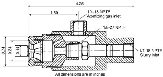 The results of studies of the spraying characteristics of coal–water fuel with a pneumatic nozzle and its combustion are presented in [7]. The nozzle was made of metal. This device provides for mixing the CWF and SA outside the nozzle (Figure 4). Such an approach allows the CWF to be sprayed with a high-speed air jet (up to 450 m/s and the Mach number about 1.4). The air pressure in the annular chamber was up to 6.0 bar and the liquid flow rate was 180–360 kg/h during the tests, which correspond to the modes in a real boiler.