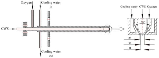 Nozzle for CWF spraying with internal mixing [21]. CWP—Coal–Water Paste.