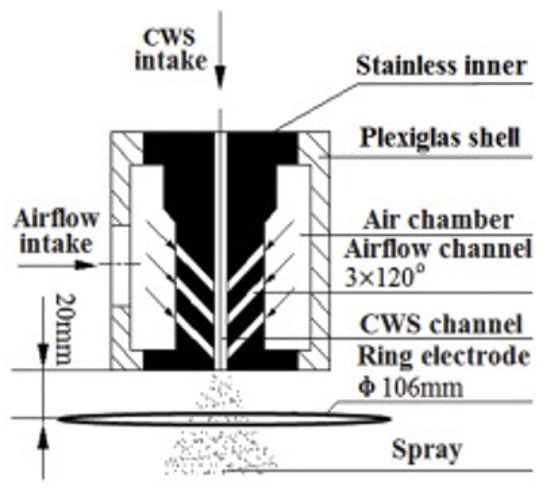 - Zheng, J.; Xu, Y.; Wang, Q.; He, H. Characteristics of particle size and velocity of droplets of coal water slurry subjected to air-blast electrostatic atomization using a phase Doppler particle analyzer. J. Electrost. 2019, 98, 40–48. [Google Scholar] [CrossRef]