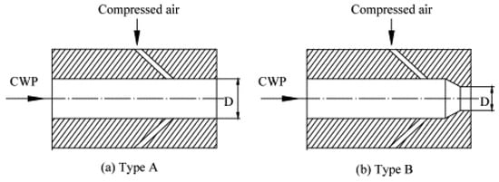 The results of experimental studies of the characteristics of CWF spraying for a fluidized bed under pressure with a fairly simple spraying device are presented in [21]. The authors took into account that CWF are complex multicomponent liquids, the properties of which significantly depend on the number and type of components. Therefore, two types of two-liquid sealed nozzles were used during the research, direct internal mixing type A (Figure 9a) and internal mixing type B (Figure 9b), with output diameters D 20, 32, and 40 mm. The CWF flow rate was 500 kg/h during the experiments.