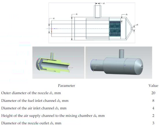 Analysis of the injectors with external mixing in [7,18,20] showed that a sufficiently fine jet can be achieved using such a mixture of fuel and SA—the average size of CWF droplets in the jet after spraying is less than 100 microns. But at the same time, the complex design and high predisposition to clogging and wear of the fuel channel make them ineffective in terms of durability. The nozzle in [20] can be distinguished from these three spraying devices. The effect of erosion wear of the fuel channel can be reduced due to the possibility of its cooling during operation. The absence of a narrowing of the nozzle and an increase in its diameter would cause the most efficient use of this spraying device in practice.