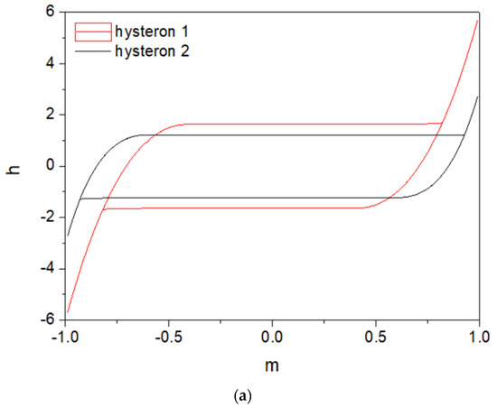 where the subscript denotes that powers with non-zero values of coefficients also behave qualitatively in a similar way. The relationship (6) is depicted in Figure 2. The remanence values for this polynomial are , and the bifurcation magnetization , whereas the corresponding value of field strength (coercive field strength) The value of magnetization when two branches of hysteresis loop coincide is approximately