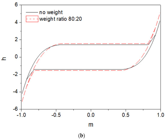 During preliminary tests, we simulated the effect of just two elementary units, one given with (5), where the value is set to , and the other given with (7). For the first unit, the loop coordinates at bifurcation points are and . Figure 3a depicts the component hysteresis loops, whereas Figure 3b shows the outcome loop for the case when no weighting was assumed, and thus the ratio of contributions was 50:50 (solid black line), and for the case when the weights were assigned following the ratio 80:20 (red dashed line).