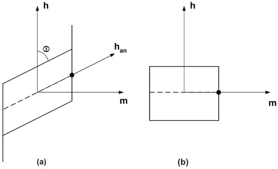 The affine transformation based on angle ; (a)—measured hysteresis loop, (b) irreversible hysteresis loop. Solid lines—hysteresis loop, dashed line—anhysteretic curve (approximate shapes). The figure may be compared to Figure 5 in [10] or Figure 10 in [39].