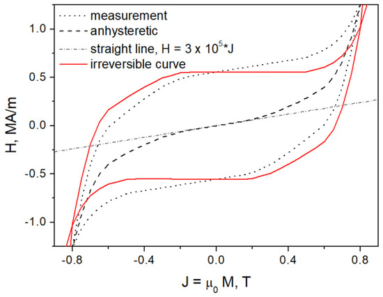 Exemplary modeling was carried out for a Pr8Dy1Fe60Co7Ni6B14Zr1Ti3 ribbon (a hard magnet, examined previously in [9]). The details on sample preparation are provided in [42]. Figure 7 depicts the decomposition of the measured hysteresis loop into the irreversible hysteresis loop related to the bistability phenomenon and the anhysteretic curve in accordance with the approach outlined in the previous section.