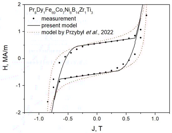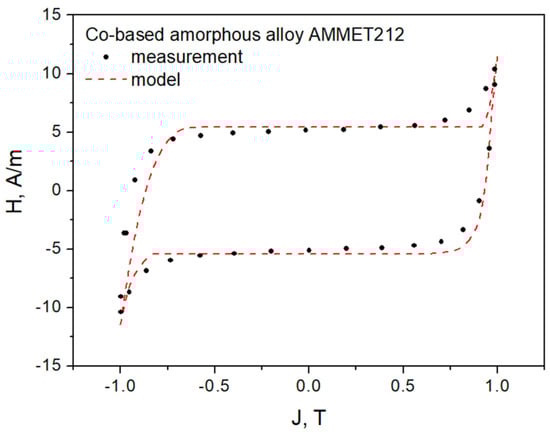 As a second attempt to apply the developed description in practice, we carried out modeling for a cylinder core wound of Co-based amorphous alloy AMMET212. As pointed out by Harrison, his approach should be valid both for soft and hard magnetic materials. The considered material is extremely soft since the measured value of coercive field strength is 5.1 A/m (this is a value five order of magnitude lower than for the praseodymium–dysprosium sample shown in Figure 8). Again, we considered a combination of just two hysterons. The J–H dependency of the first one was given with expression (7); for the other one, it was of similar type, yet with different values of coefficients, i.e.,