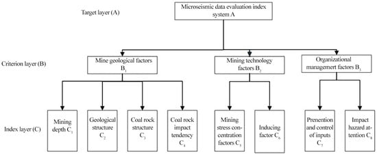The complexity and variety of influencing factors of microearthquakes necessitate a comprehensive consideration in hazard assessment. To evaluate the risk of “double high” energy and frequency of microseismic events and quantify the hazardous degree of rock breakup, an appropriate safety assessment method must be selected [39]. This requires the establishment of an evaluation index system based on several principles. Firstly, the system should reflect the objective reality and essence of microseismicity changes scientifically and objectively. Subjective and objective factors need to be considered, ensuring a balance between theory and experience. Secondly, the evaluation method and system should form a harmonious whole, providing reliable and comprehensive data and information. This includes considering objectivity, integrity, hierarchical structure, correlation, practicability, and comprehensiveness [40]. Thirdly, wherever possible, factors should be quantified to reveal the underlying causes of microseismic activity changes. Moreover, the inclusion of stable factors and exclusion of those heavily influenced by chance is necessary to maintain the stability of the evaluation index system. Additionally, the system should be designed with accessibility in mind, allowing for the examination and evaluation of the dangerous situation of rockburst and the implementation of effective risk elimination measures [41,42]. Lastly, the evaluation factor system should be feasible, facilitating data collection, simplifying procedures, and avoiding unnecessary complexity, thus ensuring easy acceptance and implementation by enterprises. Through adherence to these principles, a robust and practical evaluation index system can be established.