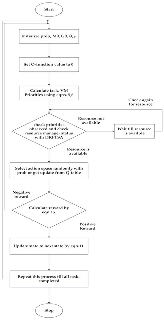 | Input: No. of tasks, i.e., , no. of virtual machines, i.e., , physical hosts/nodes , datacenters . Output: Generation of schedules for tasks mapped to virtual machines by tackling makespan, rate of failure, energy consumption. Start Initialize parameters, i.e., , , , , . Set to 0. for every batch do select calculate task priorities using Equation (5). calculate VM priorities using Equation (6). for every batch do identify priorities of both tasks, VMs to schedule based on resource manager status select action space and choose a VM with or select arg max Q( calculate reward function by Equation (15). check the reward for action done. (Identify parameters i.e., ) Update Equation (11). For next state Update to . Repeat this process until the last batch End do End do Stop |