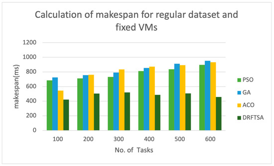 5.2. Calculation of Makespan for DRFTSA Using Regular Dataset with Fixed Number of VMs