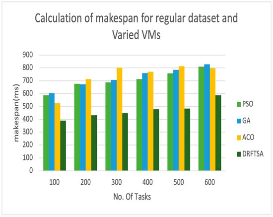 5.3. Calculation of Makespan for DRFTSA Using Regular Dataset by Varying Number of VMs