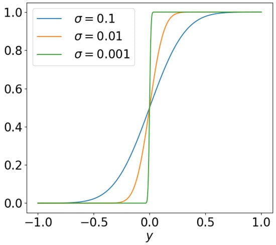where is the standard normal univariate cdf, and . An illustration of this approximation of the indicator function is displayed in Figure 1. It should be noted, however, that the uniform distribution defined on , with , is another univariate cdf often considered for the approximation of the indicator function [20,50].