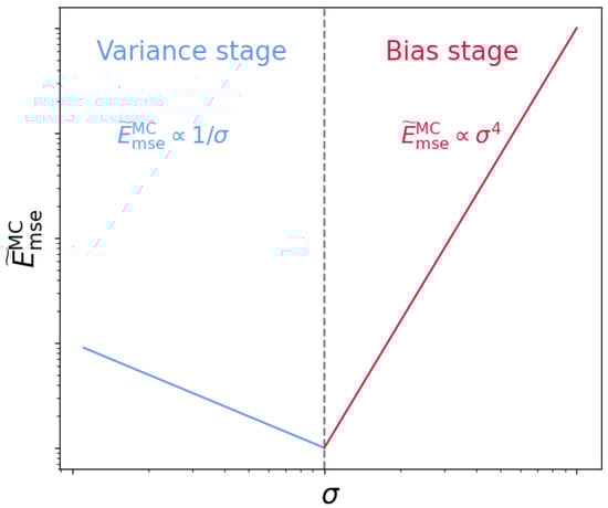In [50], analytical formulas are derived when the uniform cdf defined on the interval is chosen as the approximation of the failure domain indicator function, for the one-dimensional case (). The resulting bias e is proportional to , thus and the variance is proportional to . The proportional property of the bias is extended to the multidimensional case in [20]. Consequently, decreasing the parameter greatly reduces the bias. Nevertheless, past a certain point, the variance of the estimate increases for smaller values, if N is kept constant. This is schematically illustrated in Figure 2. The horizontal axis is separated into two stages: the bias stage where the error is mainly affected by the bias of the estimate and the variance stage where the error is mainly affected by the variance of the estimate.