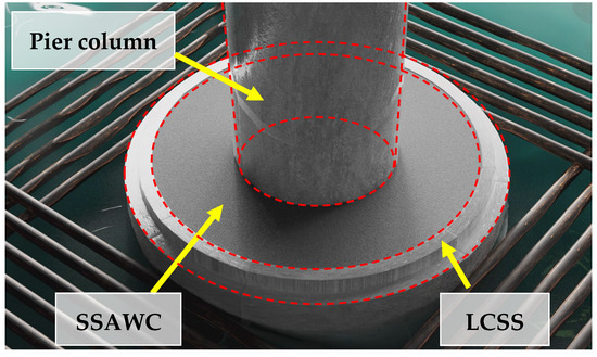 To address these limitations, our research team has proposed an improved PCSAM (IPCSAM) [2], depicted in Figure 1. On the one hand, regarding the design theory and prefabrication technology of the shield tunnel lining segments, the connection of the reinforced segment sleeve is improved by a lining concrete segment sleeve (LCSS), owing to its high precision in prefabrication [26], good joint connection strength and connection effects [27], and good durability [28]. On the other hand, self-stressed anti-washout underwater concrete (SSAWC) is applied as a filling material between the pier column and LCSS to generate accurate initial self-stress inside the filling layer. That is, an additional appropriate expansion agent is used in the SSAWC instead of applying prestress on the outer surface of the pier using wire ropes. This has the following advantages: (a) Circumferential confining pressure is applied to improve the mechanical properties of concrete in the core pier column [2]. (b) The prestress and strength losses of filled concrete are reduced [1,29]. (c) The bonding strength between the filling layer and adjacent members is increased by reducing the shrinkage effect of the filled concrete [30].