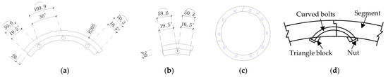 LCSS and prefabricated mold. (a) Segments; (b) Sleeve; (c) Prefabricated mold of segments; (d) Curved bolts and triangle blocks.