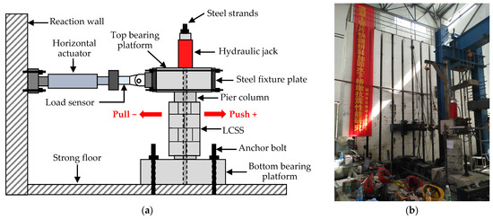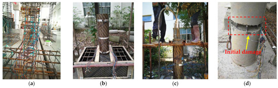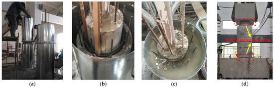 Considering the limitations of the prefabricated mold used for the segments, the LCSS was impossible to scale in equal proportions, resulting in a relatively thick LCSS. When the pier column reaches a certain lateral displacement, the full-length LCSS experiences non-predictive local compression damage due to the first contact with the bearing platform at the top or bottom of the pier column, which further influences the seismic strengthening effect and accuracy of the test results. Therefore, to avoid this phenomenon in the quasi-static test, we reserved 30 cm and 20 mm areas without strengthening at the top and bottom of the specimens, respectively (Figure 6d). The stirrups in the unreinforced area at the bottom of the pier column were densified (Figure 2).