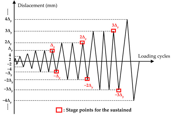 Each specimen was first anchored to a strong floor and reaction wall using prestressed steel bolts to prevent sliding during the test. Details of the loading setup are shown in Figure 7. All specimens were tested under a combination of constant axial and lateral cyclic loads. During the test, a constant target axial load corresponding to an axial compression ratio of 20% was first applied to the top of the specimen using a 30-t hydraulic jack through three steel strands passing through the pre-buried bellows at the center of the pier column. Consequently, the load was transferred to the specimen evenly and stably. A lateral cyclic load was then applied to the side of the top-bearing platform using a 50-t electrohydraulic servo horizontal actuator, and the displacement loading rate was set to 0.1 mm/s. The protocol for the cyclic displacement–control load is shown in Figure 8 and was obtained according to the “Specification for seismic test of buildings” code [62,63,64,65]. Additionally, Δy was defined as the yield displacement of a test specimen. One cycle was imposed with 2 mm increments for each loading step. After the specimen entered the yield stage, the lateral load repeated three cycles at the displacement levels of 1Δy, 2Δy, 3Δy, …, and the test was terminated once the lateral bearing capacity of the specimen decreased to 85% of the peak load or the specimen exhibited severe damage. The lateral load and displacement were recorded using a horizontal actuator. Two linear variable displacement transducers (LVDTs) were used to measure the lateral displacements at the top and bottom of the pier column. Several strain gauges were applied to record the strain in the longitudinal rebars and stirrups in the potential plastic hinge area of the pier column. The detailed configuration of the displacement meters and strain gauges is presented in Figure 9.