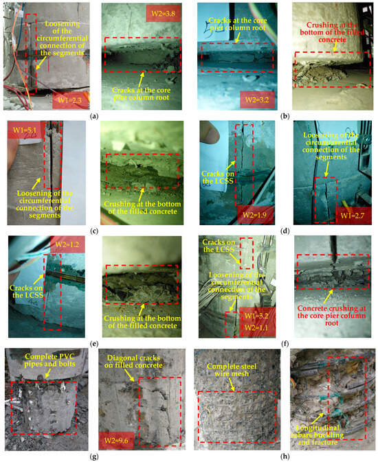 Typical failure phenomena and modes of strengthened specimens. (a) RP-0; (b) RP-1; (c) RP-2; (d) RP-3; (e) RP-4; (f) RP-5; (g) Demolition of the segment sleeves; (h) Demolition of the filled concrete. Note: W1 represents the average looseness width of LCSS, W2 represents the average crack width of concrete (unit: millimeters).