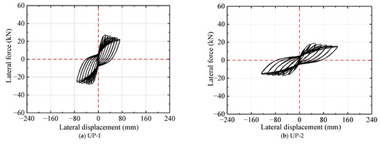 As shown in Figure 10, all unreinforced specimens UP-1, UP-2, and UP-3 with different length–diameter ratios (4, 6, and 8) displayed flexural failure modes involving the crushing of concrete at the bottom of the pier column and buckling of longitudinal rebars. All unreinforced specimens experienced the generation, development, and expansion of bending and shear cracks, as well as the crushing of concrete at the pier column root. (a) For specimen UP-1, some initial circumferential fine transverse cracks appeared along the pier column bottom when the lateral displacement reached 6 mm. The longitudinal rebars yielded when the displacement reached 8 mm. It was generally considered that the specimen yielded due to the unrecoverable plastic deformation according to the hysteretic curve, and Δy was taken as 8 mm. At the end of the Δy displacement cycle, several transverse cracks began to expand approximately 15 mm from the pier column bottom. With the increase in load displacement, the original cracks continued to extend in the horizontal direction, and several new transverse cracks were generated on the surface of the pier column during the 2Δy to 4Δy loading cycles. During the 5Δy loading cycles, some transverse cracks gradually developed into diagonal cracks and penetrated each other. Once the loading displacement reached 6Δy, the width of the penetrating cracks increased sharply, and slight spalling of concrete occurred around the cracks accompanied by a slight “splitting” sound. With further load displacement, the concrete on both sides of the tension and compression zone at the pier column bottom spalled off rapidly in blocks, and a plastic hinge gradually formed. Once the loading displacement increased to 8Δy, the concrete at the pier column root was crushed and exhibited significant peeling, leading to the longitudinal rebars and stirrups being exposed and buckling. Meanwhile, the horizontal load dropped to 85% of the peak load, and the test was terminated. (b) For specimen UP-2, when the lateral displacement reached 12 mm, several initial fine cracks began to appear at the pier column bottom; meanwhile, the longitudinal rebars had not reached the yield strength, and Δy was taken as 18 mm. During the 2Δy to 6Δy loading cycles, the transverse and diagonal cracks at the pier column bottom gradually widened, extended, and penetrated, resulting in concrete crushing and spalling at the column bottom and exposure of steel rebars at the pier column root. The test ended when the loading displacement reached 7Δy due to the significant damage to the specimen. (c) For specimen UP-3, the initial cracks appeared when the lateral displacement reached 12 mm, and Δy was taken as 20 mm. During the 2Δy to 9Δy loading cycles, the development of cracks and damaged condition at the pier column root were similar to that of specimens UP-1 and UP-2. The test ended when the displacement reached 10Δy.