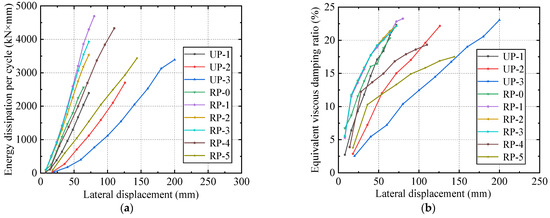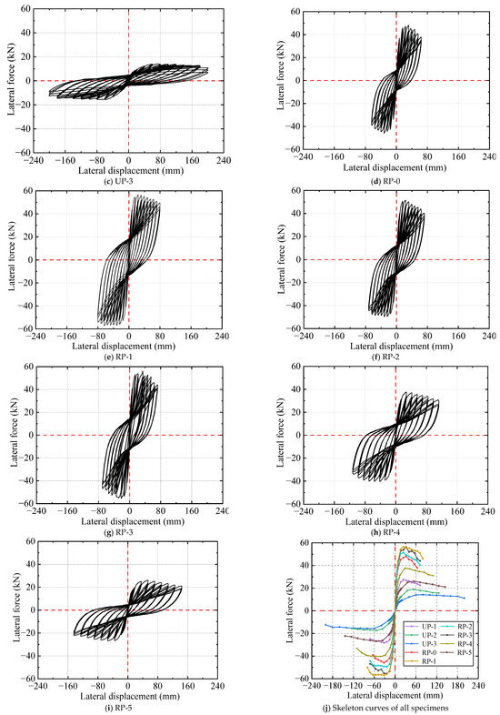 Comparisons of the skeleton curves of all specimens are shown in Figure 12j. (a) Those between reinforced specimens (i.e., RP-0 to RP-5) and unreinforced specimens (i.e., UP-1 to UP-3) indicate that the bearing capacity and initial stiffness of reinforced specimens were much higher than those of unreinforced specimens; however, the peak and ultimate displacement of reinforced specimens are generally lower than those of unreinforced specimens. The comparison between UP-1 and RP-1, UP-2 and RP-4, and UP-3 and RP-5 shows that IPCSAM can effectively improve the bearing capacity and initial stiffness of the pier column. (b) The comparison between RP-0 and RP-1 shows that SSAWC with a self-stress of 1.6 MPa can effectively improve the bearing capacity and initial stiffness of the pier column. (c) The comparison between RP-1 and RP-2 indicates that a 0.25% increase in the reinforcement ratio of LCSS can effectively improve the bearing capacity of the pier column. (d) The comparison between RP-1 and RP-3 shows that initial damage has a relatively small impact on the bearing capacity and initial stiffness of the pier column. (e) The comparison between RP-1, RP-4, and RP-5 indicates that the larger the length–diameter ratio of the reinforced specimen, the greater the bearing capacity and initial stiffness, and the smaller the peak and ultimate displacement.