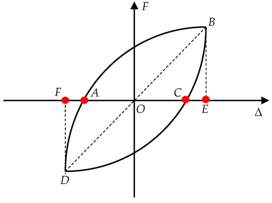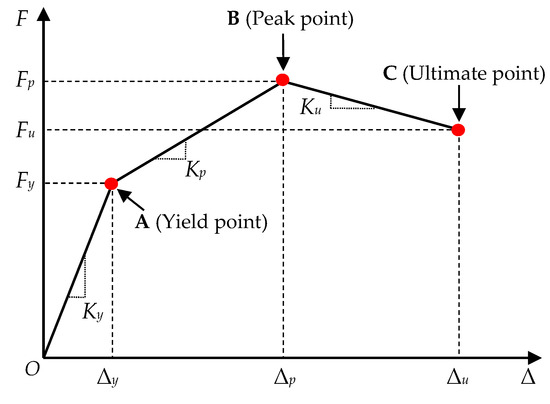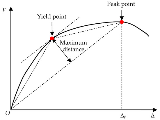 Owing to the lack of an evident yield point in the skeleton curves, a previously proposed farthest point method [66,67] was used to determine each specimen’s yield load and displacement. A schematic of the farthest point method is presented in Figure 13, which defines the yield point of the component as the point on the skeleton curve that is farthest from the line connecting the origin and peak point. The ultimate displacement Δu was defined as the displacement corresponding to the load decreasing to 85% of the peak load.