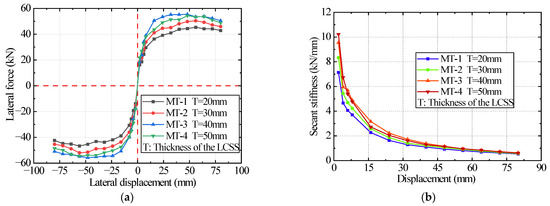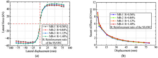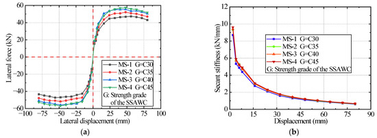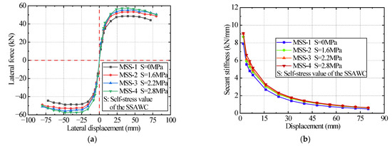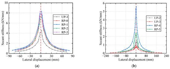 The stiffness degradation curves of all testing specimens are shown in Figure 14; each specimen’s stiffness degradation curve was relatively symmetrical, with minor differences caused by construction deviation and material anisotropy [68]. The stiffness of all specimens decreased rapidly in the early stage with increased lateral displacement and then gradually flattened out.