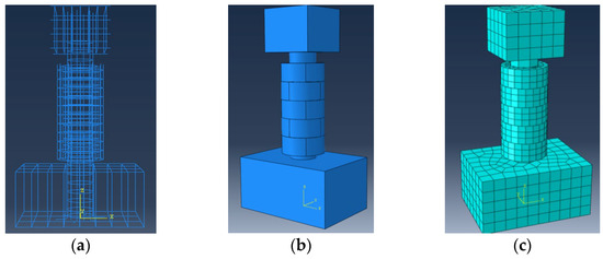 (1) The production process for the unreinforced specimens is shown in Figure 5: (a) the reinforcement cage was assembled; (b) formwork support was conducted; and (c) concrete was poured and cured. The initial damage to specimen RP-3 was inflicted by weakening a certain volume of the column body concrete before reinforcement. The position and volume of the weakened portion were calculated using finite element software ABAQUS 6.13. Foam, comprising 30% of the column’s cross-sectional area with a 40 mm height, was used to fill the calculated weakened section 30 cm from the top surface of the bottom-bearing platform when concrete was poured. The core pier column of RP-3 with initial damage was obtained by dissolving the foam in xylene after formwork removal (Figure 5d).