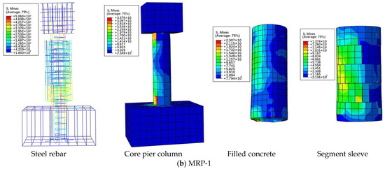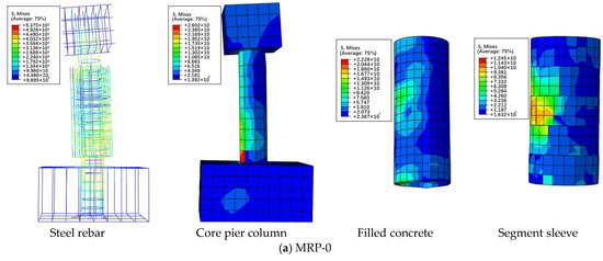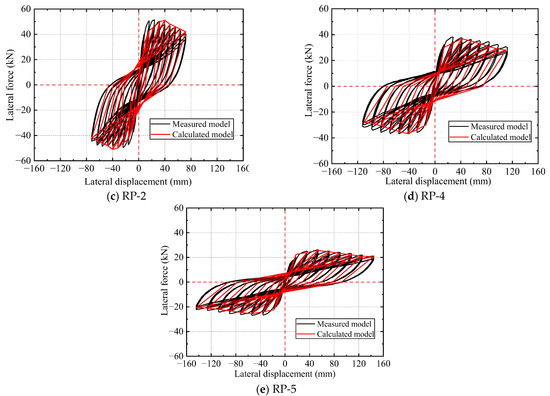 All strengthened specimens (RP-0 to RP-5) displayed flexural failure modes involving the crushing of concrete at the bottom of the core pier column and filling layer, as well as buckling and fracture of longitudinal rebars (Figure 11). All strengthened specimens experienced segment cracking, loosening of the circumferential connection of the segments, filled concrete crushing, concrete crushing and spalling at the core pier column root, longitudinal rebars pulling to fracture, and stirrups buckling. (a) In RP-1, the first transverse crack appeared at the pier column root when the lateral displacement reached 6 mm. Owing to the presence of LCSS, cracks on the surface of the core pier column could not be inspected during the test. The longitudinal rebar reached the yield strength when the displacement reached 8 mm, and the specimen reached yield strength, indicating that Δy= 8 mm. During the Δy to 2Δy loading cycles, several transverse cracks began to expand on the tensile side of the core pier column root. Subsequently, the initial transverse cracks widened and extended, gradually developing into diagonal cracks during the 3Δy to 5Δy loading cycles. Several new transverse cracks were also generated at the core pier column root. During the 6Δy to 9Δy loading cycles, the filled concrete and bottom concrete of the core pier column gradually spalled due to the rapid development and penetration of cracks. Moreover, several vertical cracks appeared at the bottom of the LCSS, and part of the circumferential connection of the segments began to loosen and separate. Finally, during the 10Δy to 11Δy loading cycles, the concrete at the core pier column root was crushed, and vertical cracks at the LCSS developed rapidly. A “bang” was heard during this progress, which was considered to be due to a longitudinal rebar fracture. The test was terminated when the horizontal load decreased to 85% of the peak load. (b) The test failure processes of specimens RP-0, RP-2, and RP-3 were similar to those of RP-1. (c) The initial cracks for specimens RP-4 and RP-5 appeared at the core pier column root when the lateral displacement reached 12 mm, and Δy was set to 14 and 18 mm, respectively. Similar to that of RP-1, during the Δy to 8Δy loading cycles for RP-4 and RP-5, cracks developed at the core pier column root and LCSS, the circumferential connection of the segments loosened, the bottom of the filled concrete was crushed, and crushing and spalling of the concrete occurred at the core pier column root.