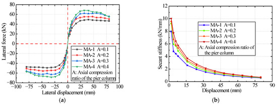 - An increase in the length–diameter ratio of a strengthened pier column can significantly reduce its seismic performance. An appropriate axial compression ratio can improve the bearing capacity, stiffness, ductility, and energy dissipation capacity of strengthened pier columns, and the axial compression ratio should not exceed 0.3.