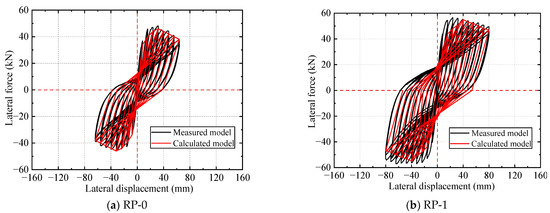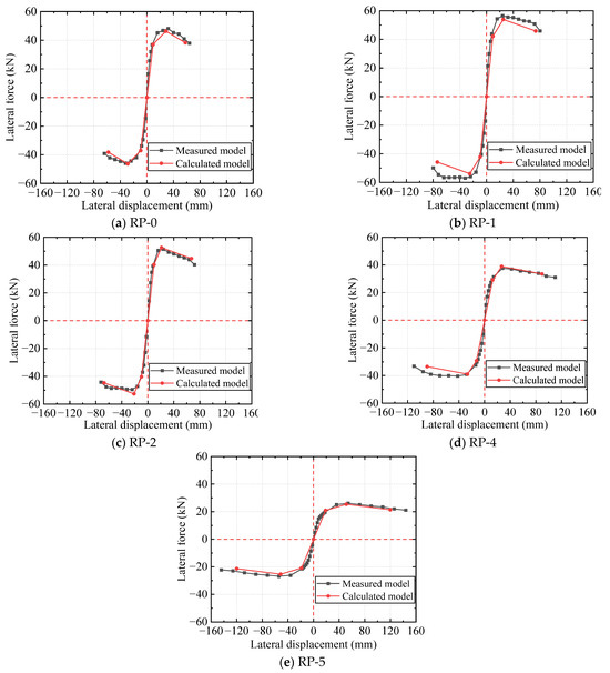 The force–displacement hysteretic models of all specimens during the loading process are shown in Figure 12a–i. The hysteretic curves of all unreinforced specimens exhibited a “bow” shape with a noticeable pinching effect. Meanwhile, those of all strengthened specimens presented an “inverse S” shape, indicating that the bond-slip between steel bars and concrete existed in the loading process. Generally, for the strengthened specimens, at the initial loading stage, the lateral force was approximately proportional to the lateral displacement before the internal longitudinal rebars yielded, and the residual deformation, hysteresis loop area, and energy dissipation were small, reflecting the elastic state of the pier columns. With the increase in lateral displacement until reaching the peak point, the hysteresis loop became less steep, owing to the development of concrete cracks and slippage between the steel bars and concrete. The residual deformation and energy consumption increased step by step, and the stiffness gradually degraded, reflecting the elastic–plastic stage of the pier columns. After reaching the peak load, the energy-dissipation capacity of the specimens continued to improve; however, the bearing capacity and stiffness rapidly degraded until the specimens were damaged.