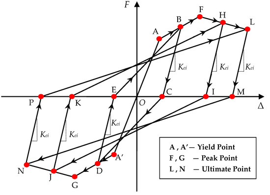 where Fi represents the peak load of the first displacement cycle in the i-th loading step, and Δi represents the corresponding displacement of the Fi; + and − represent the values obtained in the positive and negative directions, respectively.