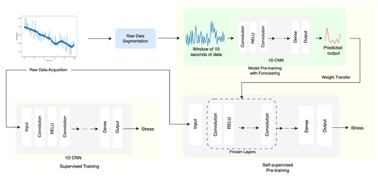 In addition, a second 1D CNN model with the same architecture as the fine-tuned model was employed for stress prediction, but without any pre-training. This is our control model, which we used as a baseline to quantify the benefits of our SSL over personalization without SSL.