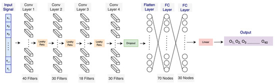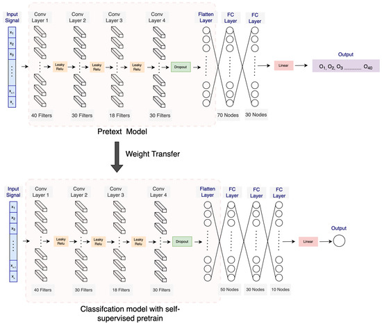 We pre-trained our model through forecasting, a similar technique used to pre-train OpenAI’s GPT language model [31]. A separate model was pre-trained for each human subject using only the data from that subject. To pre-train our model, we employed a 1D CNN, a standard neural network architecture for signal prediction [32]. Prior research has demonstrated the robustness of the 1D CNN in 1D signal processing tasks, particularly in the domain of biosignals or 1D signals [6]. One of the key advantages of 1D CNNs is their ability to automatically learn relevant features from the input signal, eliminating the need for manual feature engineering. This can save time and effort while also improving the model’s performance, as it can adaptively learn the most-discriminative features for a given task.