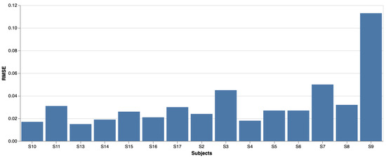 RMSE for the signal forecasting pre-training task for all subjects. The low RMSE indicates that the model learned the baseline dynamics of each user’s EDA biosignal.