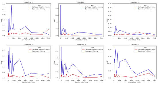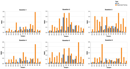 Across the six questions, the performance metrics are depicted using RMSE values, comparing self-supervised learning (SSL) against purely supervised training. For Question 1, SSL excelled particularly with Subject S8, demonstrating a significantly lower RMSE. For Question 2, SSL showed more-favorable results for a majority of the subjects, especially for S2 and S3. For Question 3, the most-commendable SSL performance was observed for S7. Moving to Question 4, S8’s RMSE for SSL was notably efficient. For Question 5, both S3 and S8 stood out with SSL achieving lower RMSEs, while for Question 6, S7 was once again a highlight for SSL. Consistently, SSL demonstrated superior performance, with lower RMSE values being indicative of its effectiveness across subjects.