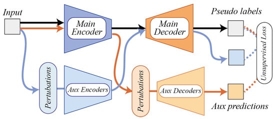 The overall flow of semi-supervised training: Main modules first generate pseudo labels on original unlabeled data, which is shown in black arrows. Then, auxiliary modules make predictions on perturbed data, and unsupervised loss is designed to measure the discrepancy between pseudo labels and perturbed prediction, which are shown in light blue arrows (predictions perturbed by auxiliary encoders) and orange arrows (predictions perturbed by auxiliary decoders).