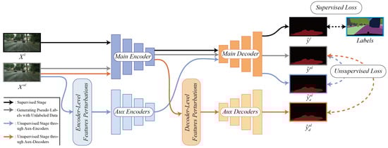 We innovatively set up a set of auxiliary encoders and a set of auxiliary decoders, and by cross-connecting the main encoders and decoders through them, we ensure that all the main modules are involved in the gradient update during unsupervised training. If only one set of auxiliary modules is employed (for example, using only auxiliary decoders), then only the main module to which it is cross-linked (the main encoder, in this case) achieves gradient updating, while the main module (the main decoder, in this case) corresponding to this auxiliary module does not leverage the information in the unlabeled data. Perturbations are artificially designed for generating similar inputs and they are introduced into different nodes of the model: the encoder and the decoder. Such dual auxiliary module structure allows our semi-supervised methods to be applied to nearly all models based on an encoder–decoder structure. Furthermore, the fact that only the main modules are involved during inference makes our method less computationally dependent than others, making it suitable for drivable area segmentation.