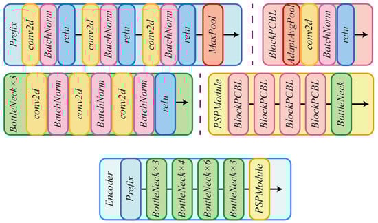 - The main-encoder is based on ResNet-50 [], with dilated convolutions, followed by one PSP module [] for additional enhancements in extracting features. It is a widely used general backbone that has been proven to have good performance in different segmentation tasks. The input of the main-encoder is unperturbed images and it outputs feature maps as the input for the main-decoder. The feature maps concatenate both high-dimensional and low-dimensional features, extracted by residual layers composed of a series of bottleneck blocks, shown in Figure 3.Figure 3. The detailed structures of the main-encoder.